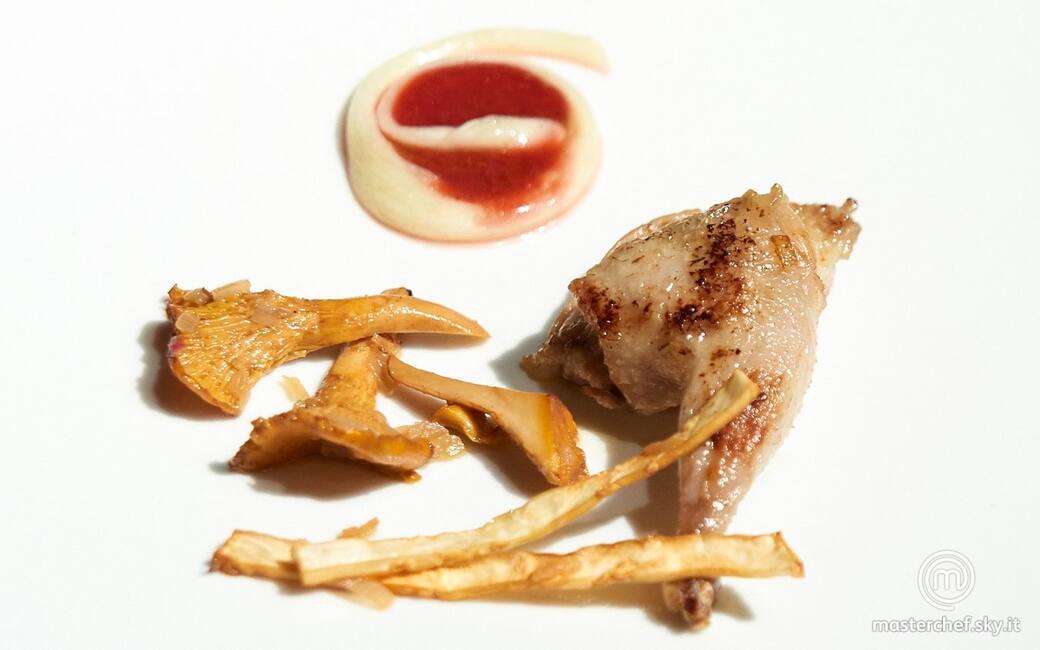 Quaglia ai frutti rossi con finferli, chips di sedano rapa e scamorza affumicata
