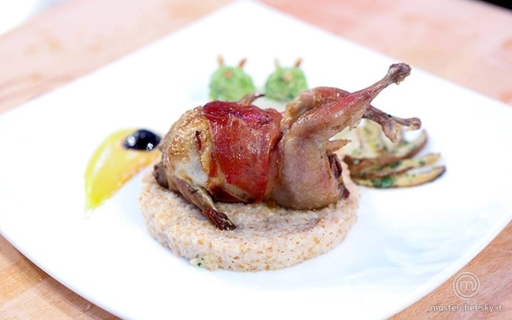 Impiattare al centro il farro e adagiarvi sopra la quaglia. Disporre a lato il bastoncino di formaggio e aggiungervi sopra due quenelles di fave con i pinoli tostati. Creare una goccia con la salsa all'uovo, adagiare sopra un acino d'uva e infine creare un ventaglio di funghi cardoncelli trifolati.