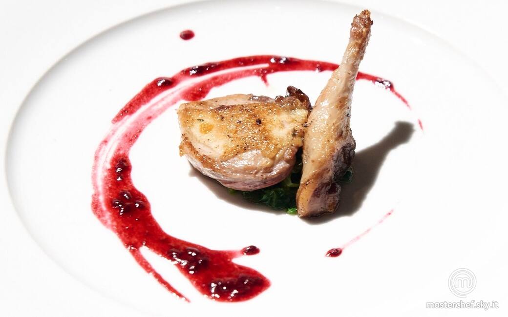 Impiattare disponendo la scarola, un petto e una coscia e i finferli. Nappare con il fondo di cottura e decorare con un giro di salsa ai frutti di bosco. Aggiustare di sale e pepe.