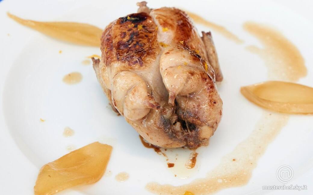 Servire la quaglia disponendola nel piatto con un filo d'olio e qualche petalo di cipolla caramellata.