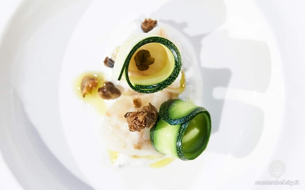 Tagliare in tre pezzetti la rana pescatrice. Nel piatto mettere una cucchiaiata di yogurt e capperi. Adagiare la rana pescatrice. Aggiungere le zucchine arrotolate e i capperi fritti.