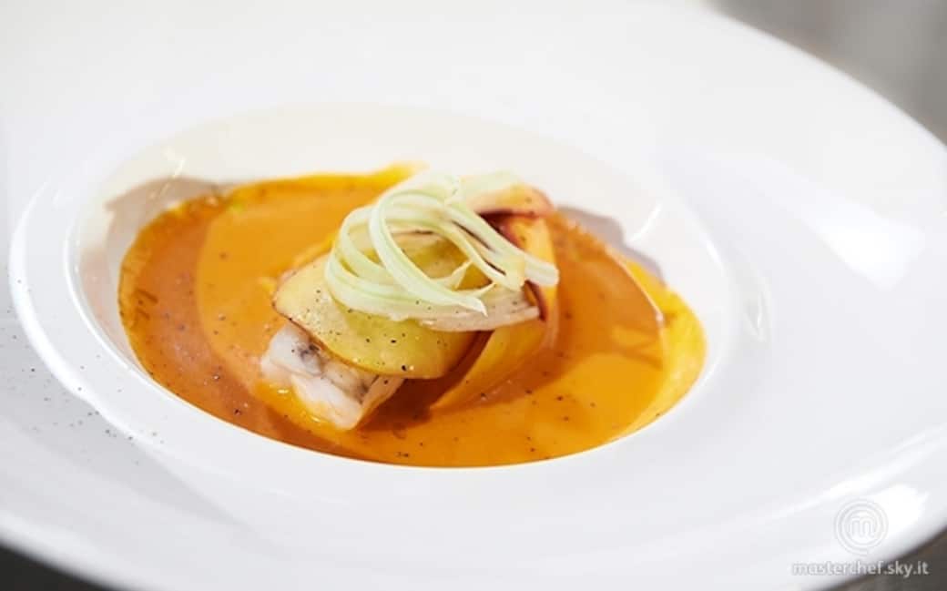 Versare il gazpacho sul fondo di un piatto adagiandovi sopra la rana pescatrice in cartoccio di pesca. Guarnire con sedano croccante e una lacrima d’olio.