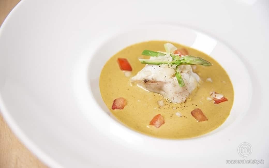 Versare con la salsiera il brodo frullato. Adagiare i bocconcini di rana pescatrice. Guarnire con gli asparagi croccanti e la macadamia tritata. Infine disporre i dadi di pomodoro avanzati.