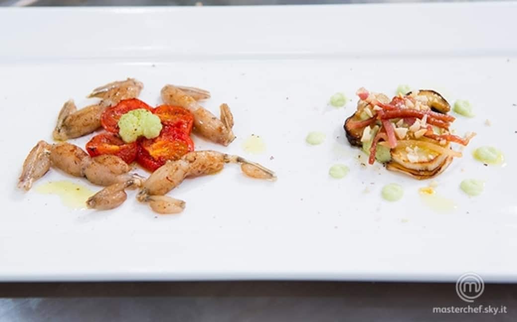 A questo punto, in un capiente piatto piano, creare una millefoglie di porcini e crema di broccolo con almeno tre strati per elemento. Coprire con la julienne di guanciale e le mandorle tostate. A fianco, dopo averli setacciati, posizionare la polpa dei ciliegini in modo da formare un letto su cui adagiare le cosce di rana cotte con burro e salvia. Grattare su tutto il piatto del pepe di Giamaica, con forte aromaticità. Concludere con un filo di olio extravergine.