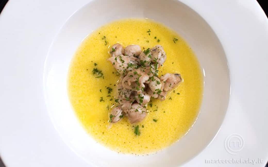 Disossare le rane. Con le carcasse formare un fondo chiaro. Cuocere le rane per qualche minuto a temperatura bassa nel fondo appena preparato.