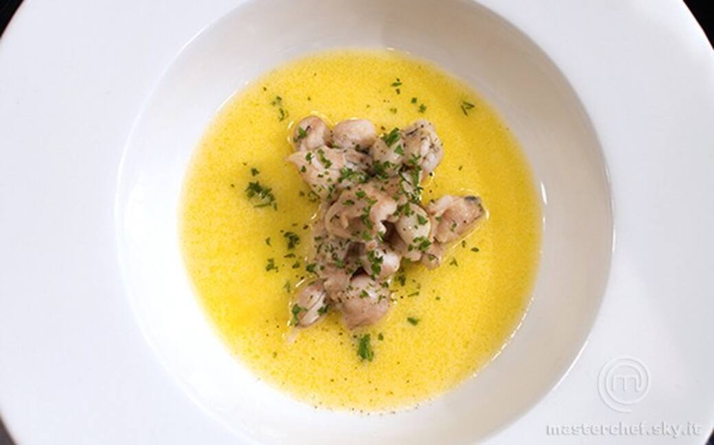 Preparare il burro bianco con 5 cucchiai di vino bianco, 3 cucchiai di aceto e gli scalogni tritati finemente. Aggiungere due cubetti di burro freddi alla volta man mano che il burro lega. Salare e, una volta che il burro risulta profumato, frullarlo. Passarlo al colino e tenerlo al caldo in una ciotola.