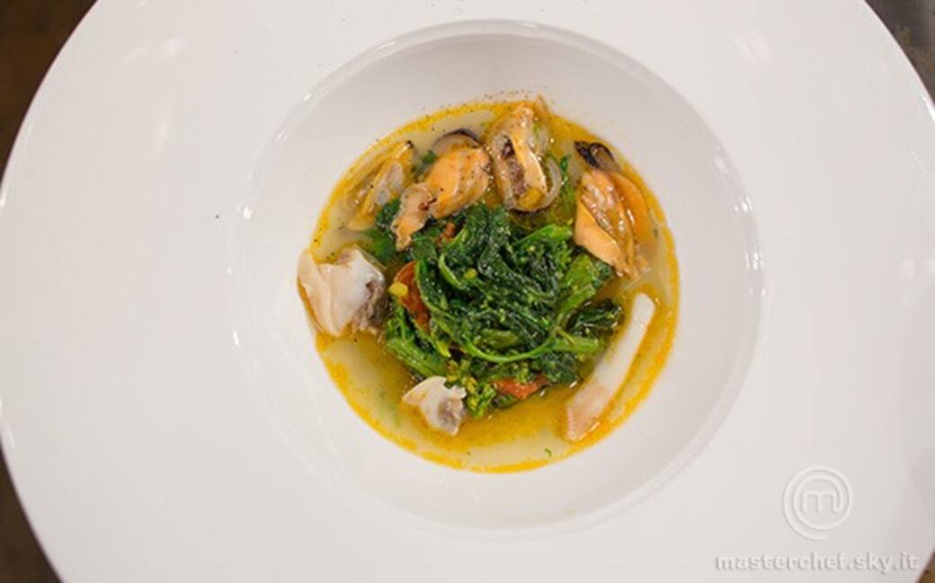 In una fondina poggiare un nido di rape, unire il guazzetto dei frutti di mare con alcuni molluschi precedentemente aperti.