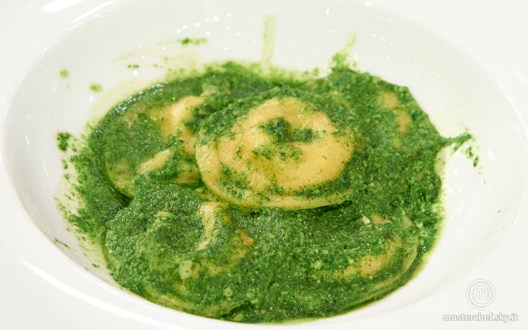 Scaldare il pesto e saltarvi i ravioli. Impiattare e aggiustare di sale e pepe.