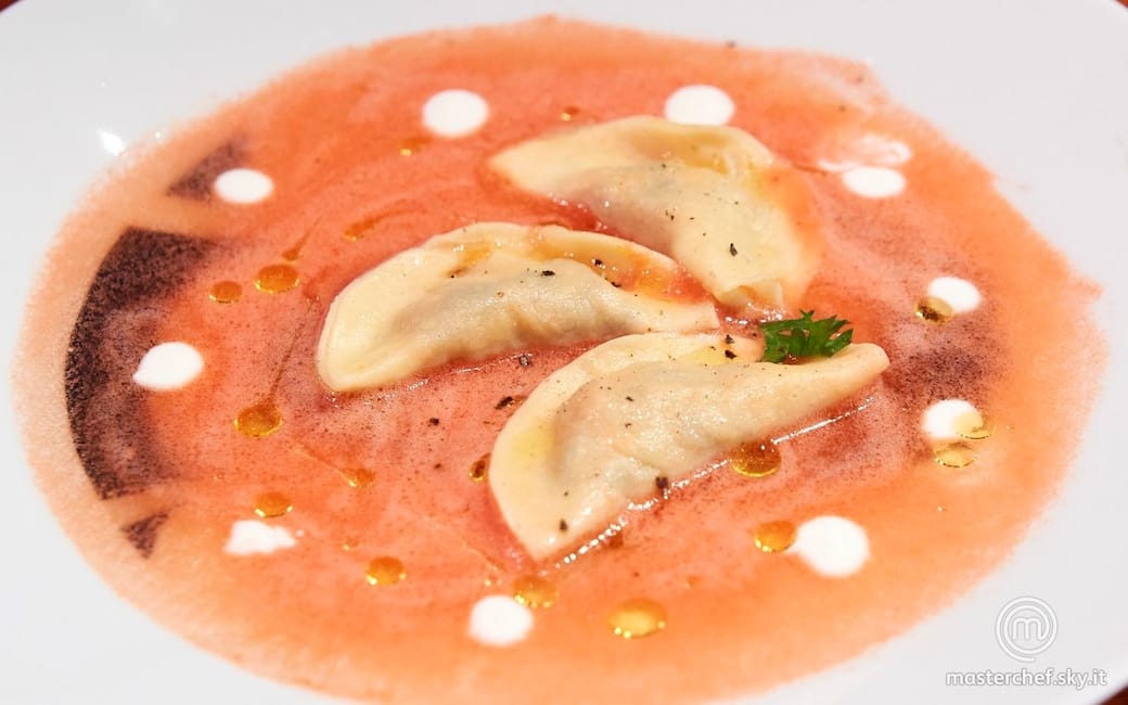 Impiattare versando uno specchio di acqua al pomodoro nel piatto. Aggiungere i ravioli, qualche goccia di panna e di olio evo e una macinata di pepe. Decorare con una foglia di prezzemolo.