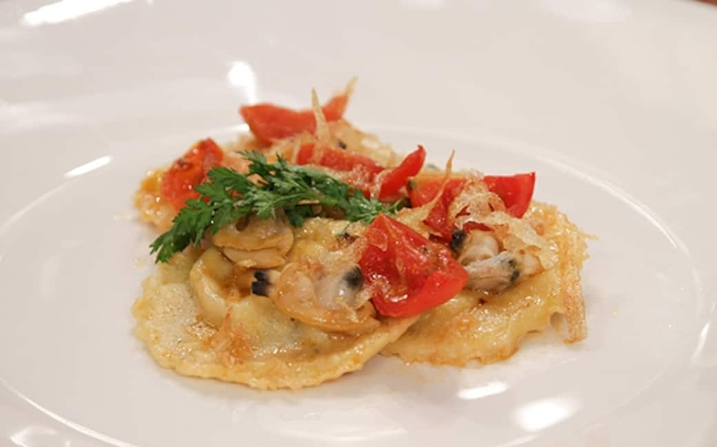 Saltare i cubetti di pesce in olio con poche olive e capperi. Frullare il tutto con mascarpone e farcire i ravioli realizzati con acqua, farina, uova e sale.