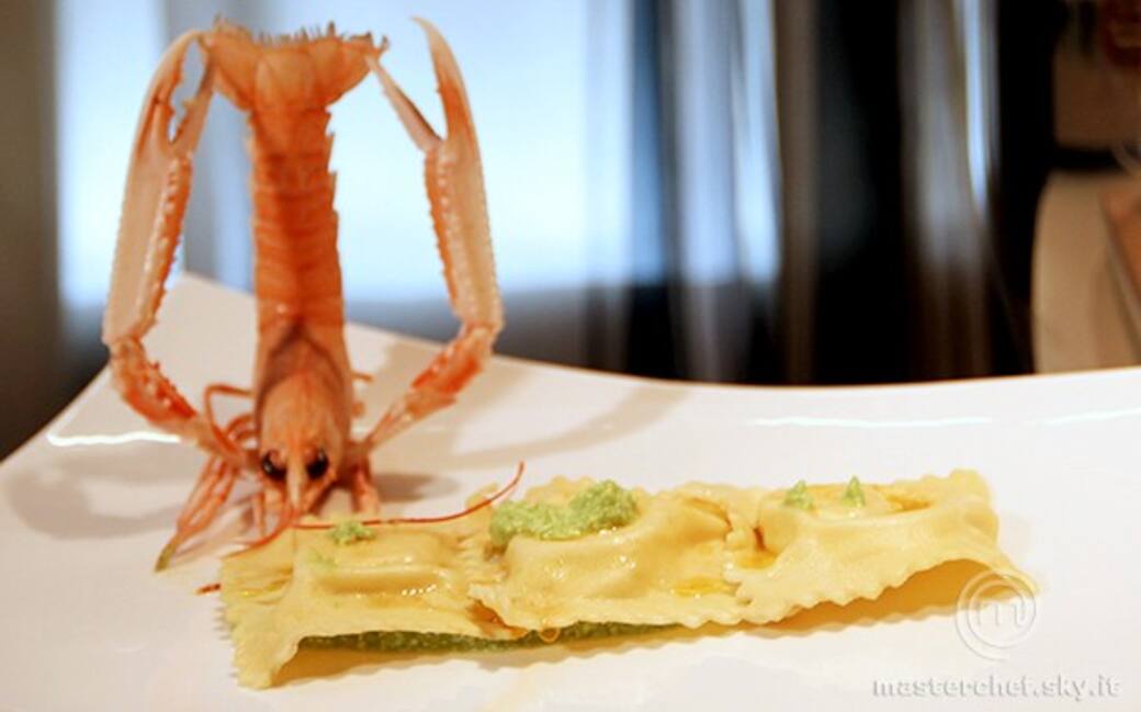 Ravioli di scampi su crema di piselli
