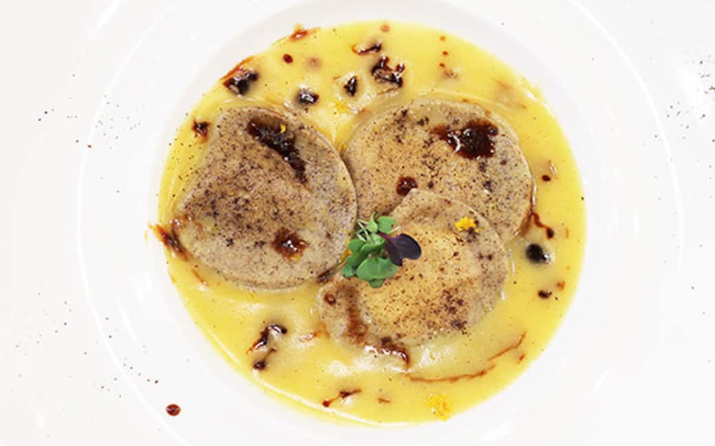 Impastare uova e farina. Tirare la pasta e preparare un ripieno di ricotta e germogli di menta e scorza d’arancia. Creare così un raviolo.