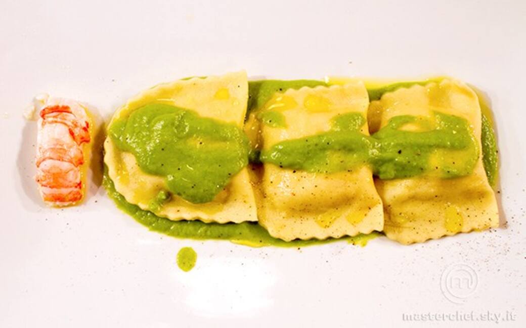 Adagiare su un piatto rettangolare uno strato di crema, disporvi sopra 3 ravioli, un goccio d’olio e pepe. Aggiungere uno scampo per guarnizione.