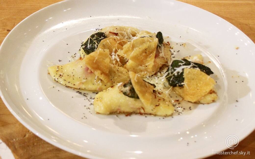 In un’altra padella far scaldare il burro con la salvia e la ricotta affumicata grattugiata. Appena affiorano i ravioli scolarli e metterli in padella.
