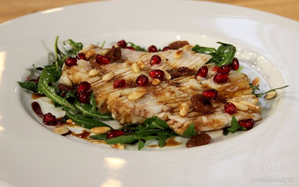 Impiattare le razze con sopra i semi di melograno, uva sultanina e pinoli. Spargere sopra il resto dell’olio d’oliva e aceto balsamico.