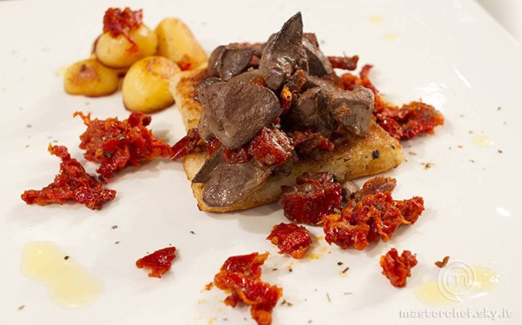 Versare i fegatini in una ciotola, mettere un po’ d’acqua e idratare per pochi minuti i pomodori secchi, aggiungere l’acqua ai fegatini, successivamente aggiungere anche i pomodori.