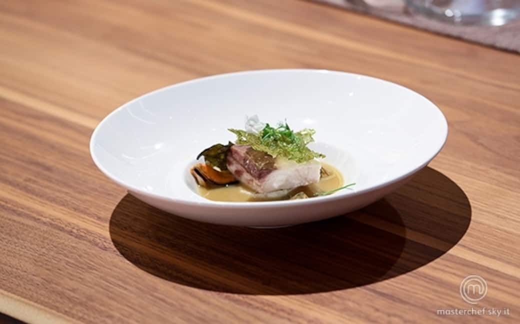 Ricciola affumicata brodo di miso al lemongrasse e zenzero e alghe croccanti