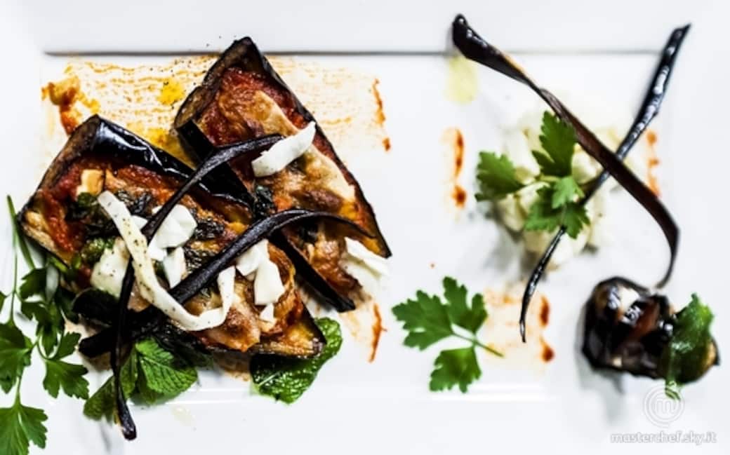 Disporre nel piatto i pezzi di bufala tagliati a giardiniera, un foglia di basilico e, ai due lati, le melanzane con la farcia. Comporre la millefoglie di melanzane, alternando salsa, mozzarella e dischi di melanzane fritte. Aggiungere i pomodori confit, un filo d'olio, una spolverata di pepe e guarnire con alcune foglie di menta prezzemolo o basilico.