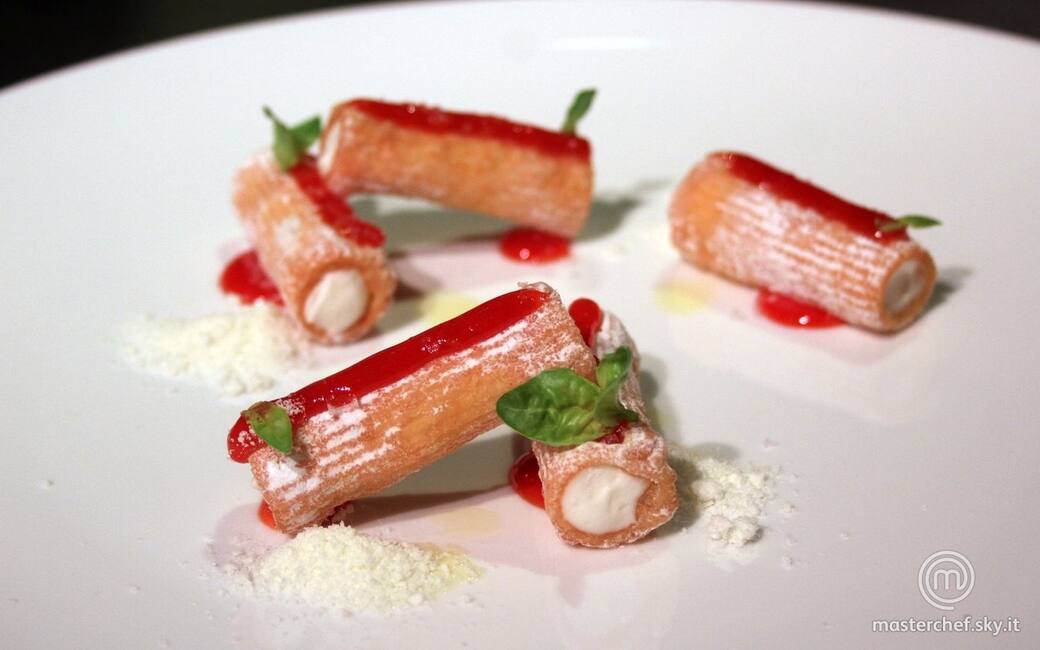 Per il ripieno frullare la stracciatella di bufala o burrata con la panna, scaldarne un terzo e portarlo a 40°C, aggiungere la colla di pesce. Far raffreddare il tutto e mettere in una sac à poche.