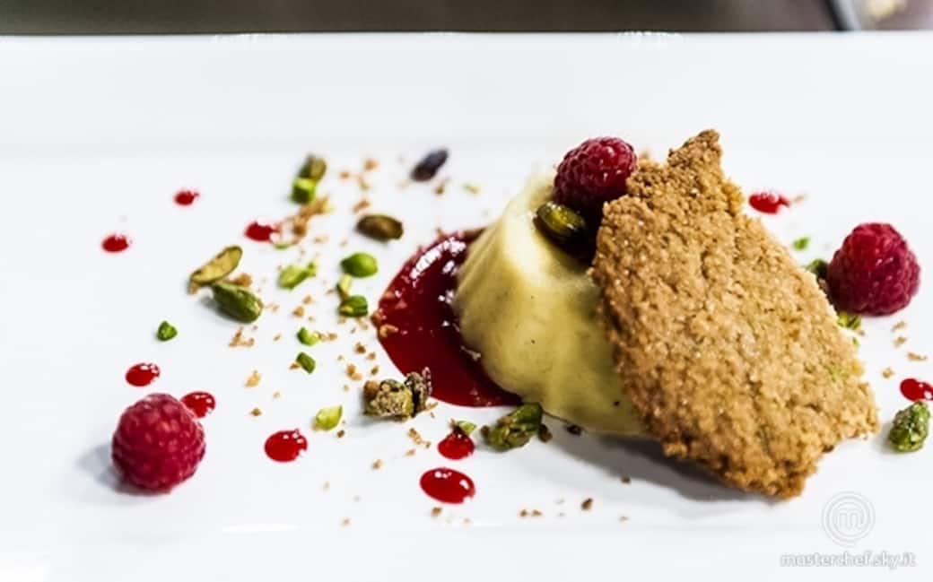 Lasciare raffreddare la tortina di ricotta e disporre sulla crema. Tostare i pistacchi e disporli sul piatto. Disporre il biscotto sul piatto e servire.