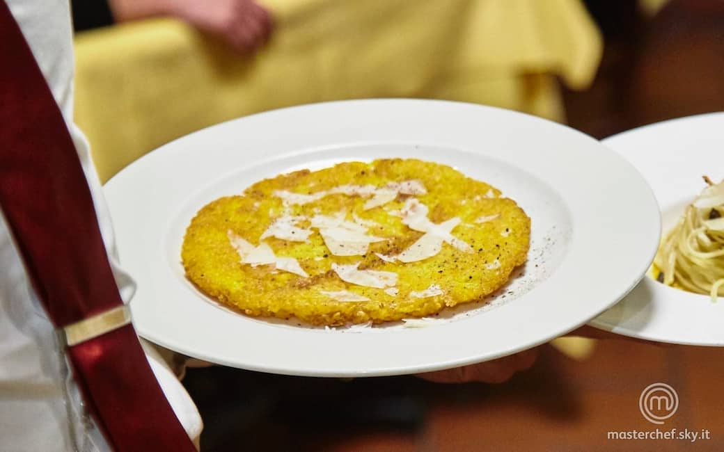 Una volta raffreddato rimetterlo in padella con una noce di burro e con l’aiuto di un apposita paletta gli daremo la sua classica forma appiattita. Quando il primo lato sarà rosolato lo salteremo e lo rosoleremo anche dall'altro lato. Servire caldissimo con scaglie di grana padano e una spolverata di pepe nero.