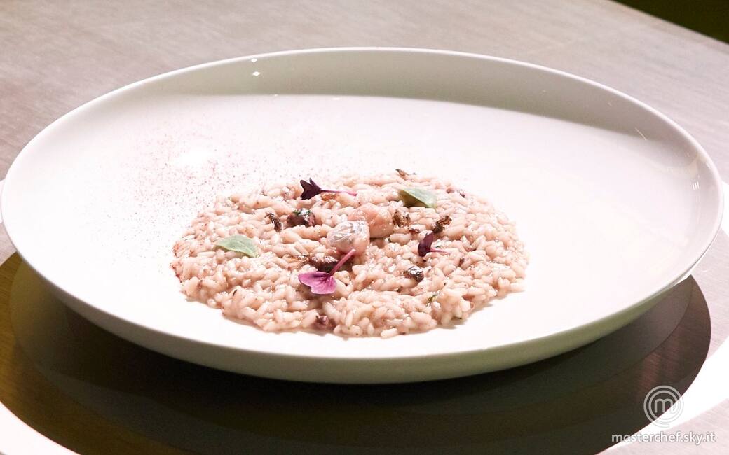 Servire il riso con la pelle croccante sbriciolata e due guance per piatto. Aggiustare di olio evo, sale e pepe e decorare con germogli.