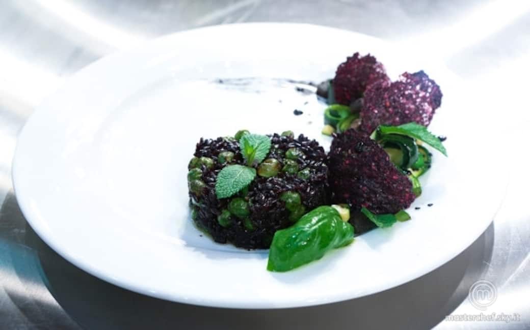 Comporre il piatto coppando il risotto e decorando con delle strisce di zucchine arrotolate, crostini, qualche pisello, chips di polenta, sesamo e qualche goccia di riduzione alle more.