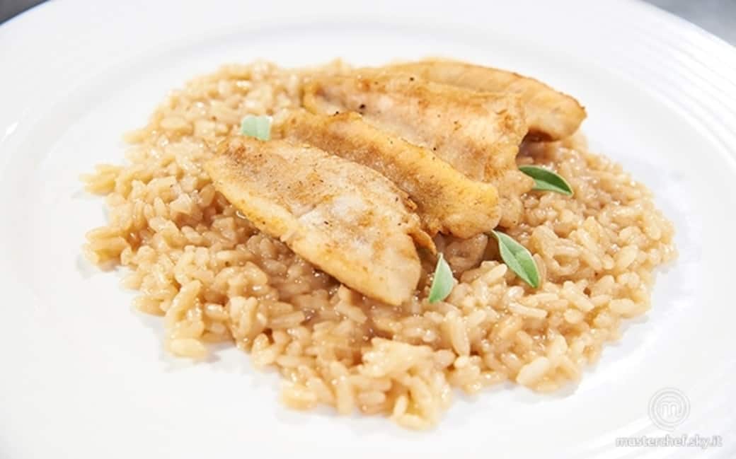 Impiattare: Distribuire il risotto nel piatto, disporvi sopra i filetti di persico dorati e condire con qualche fogliolina di salvia.