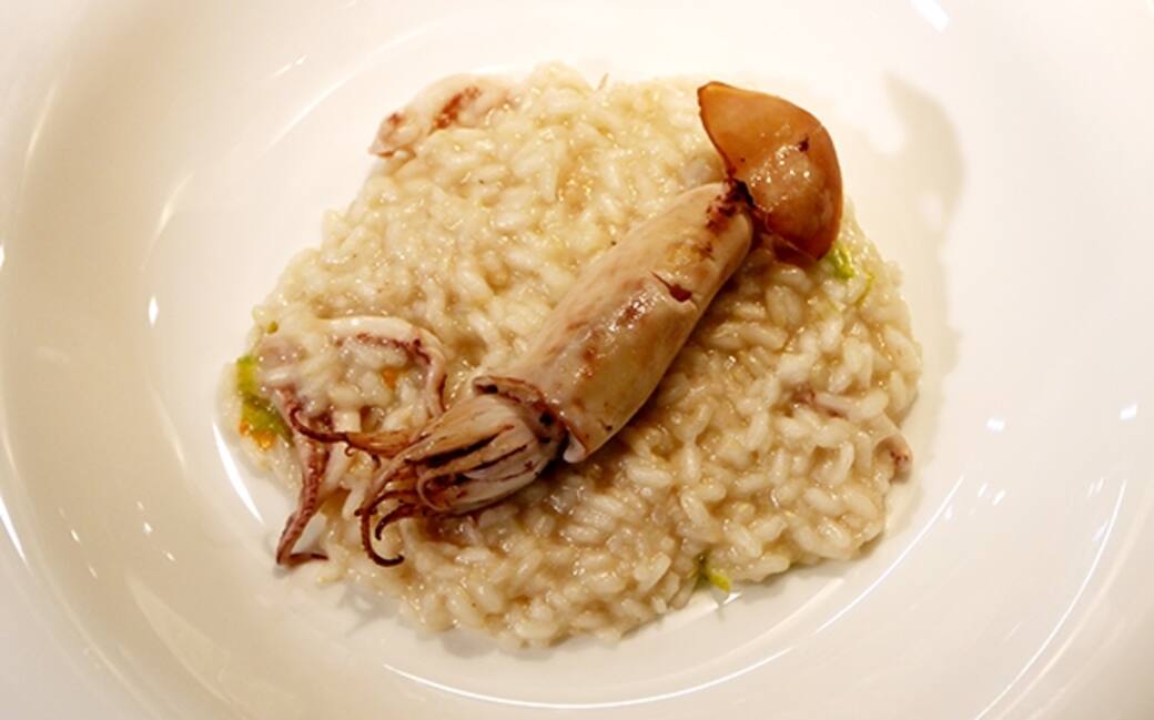 Aggiungere il riso e farlo tostare per due minuti. Sfumare con il vino e far evaporare. Programmare il timer per 18 minuti a temperatura 100° e versare il brodo. A cottura quasi ultimata unire i tentacoli dei totani e i fiori di zucca a listarelle.