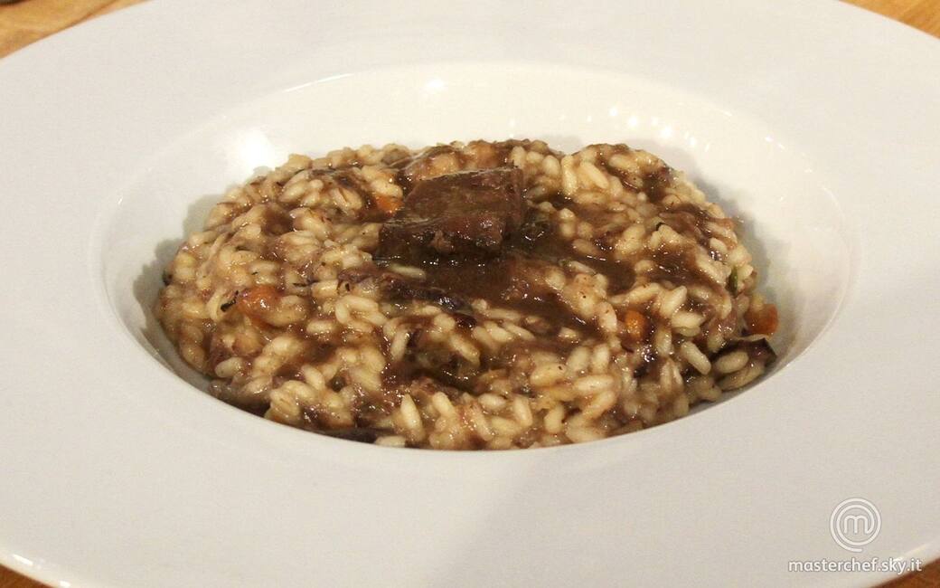 Mettere il risotto nel piatto e spolverare con polvere di liquirizia.