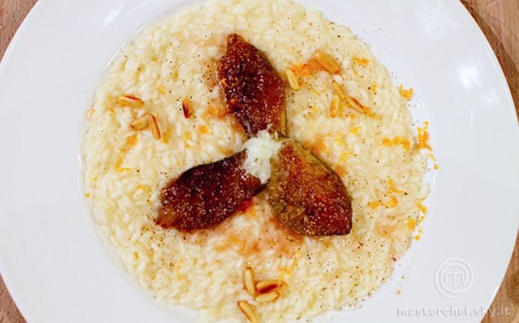 Impiattare: disporre al centro dei piatti il risotto, mettere al centro tre spicchi di fico caramellato, dei pinoli precedentemente tostati e una spolverata di buccia di pompelmo.