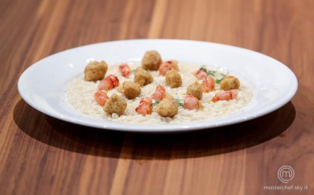 Preparare il risotto facendo tostare il riso nel burro, sfumare col vino bianco e aggiungere il fumetto poco alla volta fino a cottura. Mantecare con una noce di burro e parmigiano.