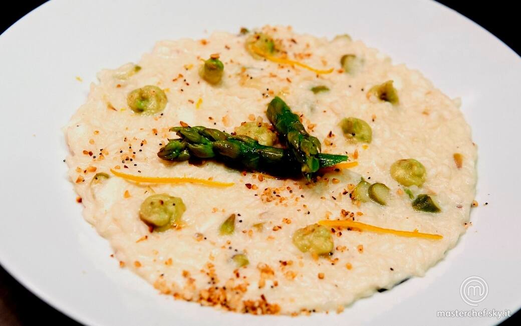 Impiattare il risotto e decorare con punte di asparagi, zest d’arancia semi di papavero. Completare il piatto con una piccole noci di guacamole all'arancia.