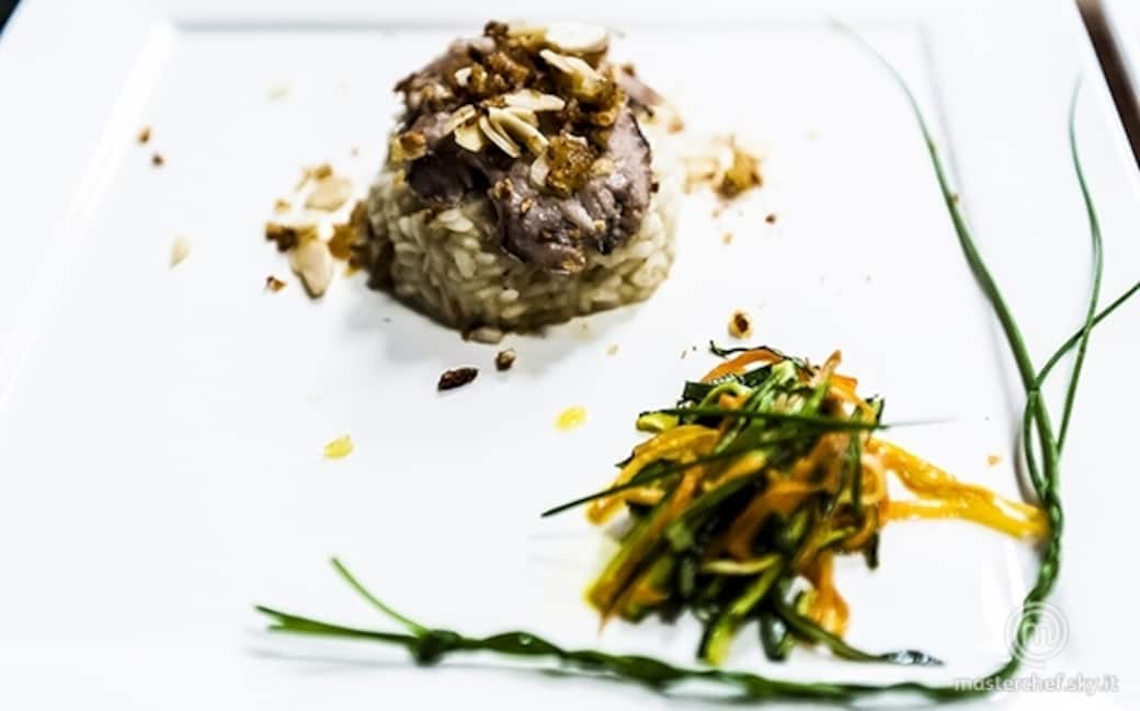 Servire il risotto guarnito con due filetti di pesce, le verdurine rosolate, mandorle e crosta di pane tostate. Aggiustare di sale e pepe.