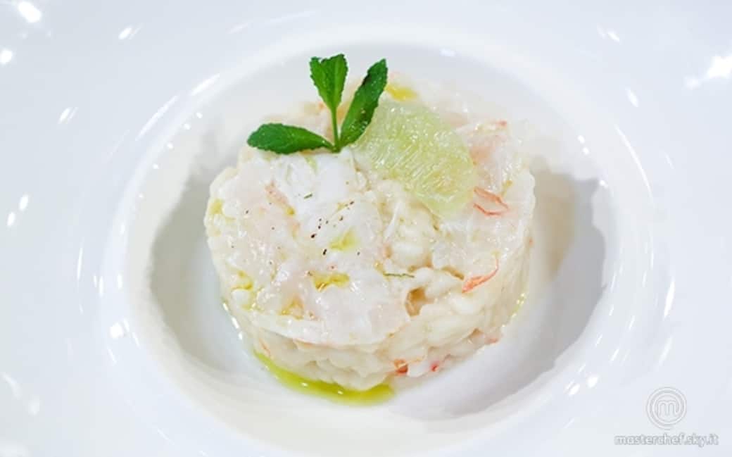 Impiattare ponendo il risotto in un coppa pasta e appoggiarci in cima la battuta di scampi, una fettina di lime tagliata a vivo e una fogliolina di menta.