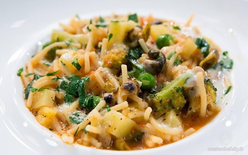 Mentre le lumachine cuociono in una casseruola far scaldare una noce di burro e un filo di olio evo, aggiungere le patate pelate e tagliate a dadini e far rosolare. Quando le patate saranno dorate, aggiungere il broccolo tagliato a piccoli spicchi e i piselli. Far rosolare il tutto, aggiungere gli spaghetti spezzettati e procedete a cuocere il tutto aggiungendo gradualmente acqua calda come si stesse cucinando un risotto. A metà cottura aggiungere l'umido di lumache e portare a cottura al dente.