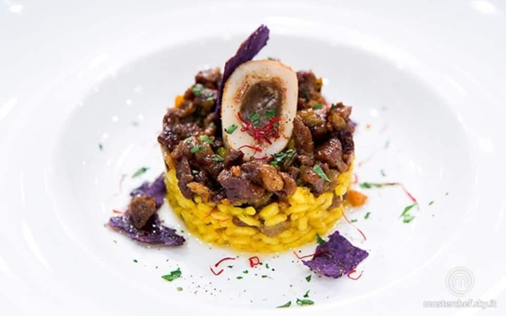 Rosolare lo scalogno finemente tritato con poco burro, tostare il riso, e farlo cuocere con il brodo vegetale precedentemente filtrato; a metà cottura unire lo zafferano precedentemente messo a bagno in un bicchierino d'acqua e un cucchiaio dello spezzatino, continuare la cottura e aggiustate di sale e pepe. Mantecare il riso con parmigiano e burro e lasciare riposare qualche minuto prima di Impiattare.