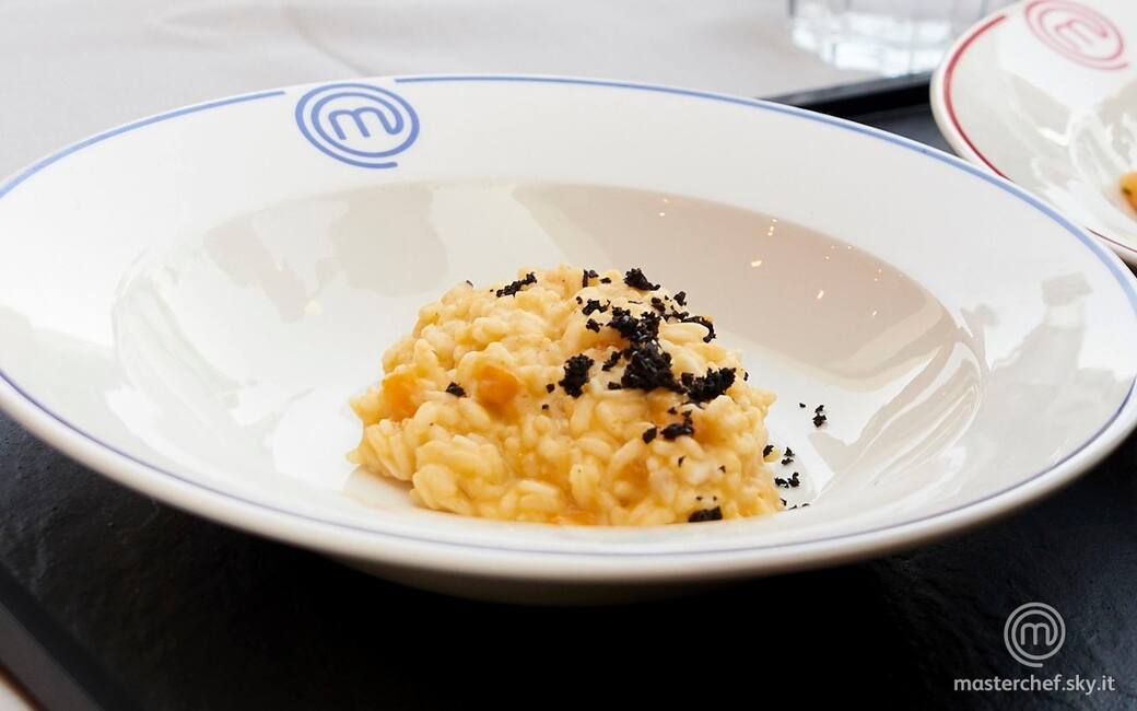 Soffriggere la cipolla rossa in una padella con un filo di olio evo e il trito di aromatiche. Aggiungere la zucca, cuocerla qualche minuto e frullarne una parte. Tostare il riso, sfumare con il vino bianco, lasciar evaporare e cuocere a fuoco moderato aggiungendo brodo vegetale.