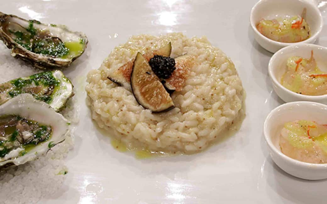 Impiattare il riso coppandolo e decorare con degli spicchi di fichi. Sui fichi porre una quenelle di caviale ed un giro di olio all’acqua delle ostriche. Accompagnare con gli scampi marinati e le ostriche alla rucola.