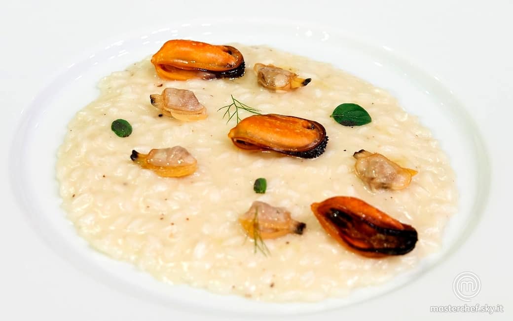 Disporre il risotto al centro del piatto, battere il piatto, disporre 5 vongole e 3 cozze in linea, qualche fogliolina di maggiorana e 2 ciuffetti di finocchietto. Ultimare con un filo d’olio a crudo.