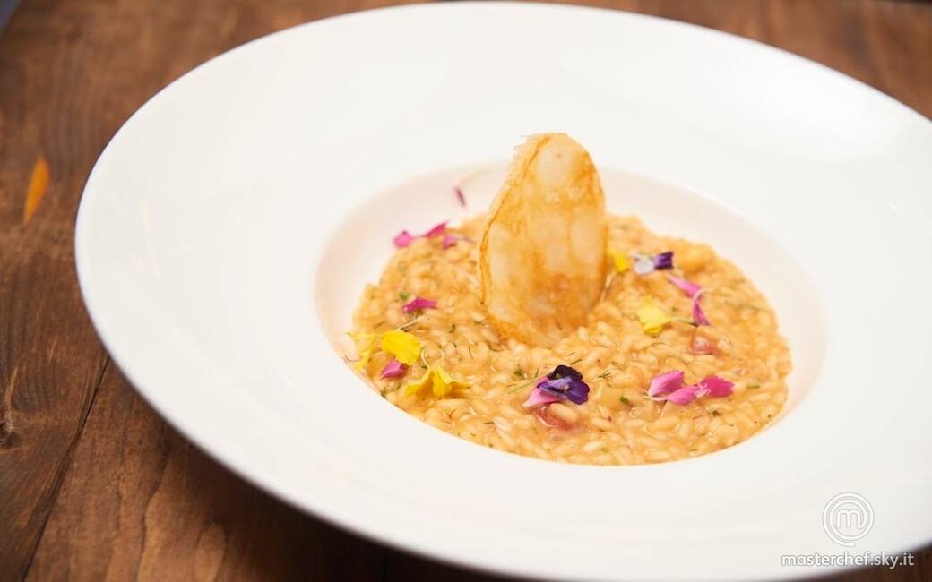 Mantecare il riso giunto a cottura con burro, il resto del parmigiano grattugiato, olio, finocchietto selvatico e il vino rimasto. Distribuire il risotto nei piatti e guarnire con fiori eduli.