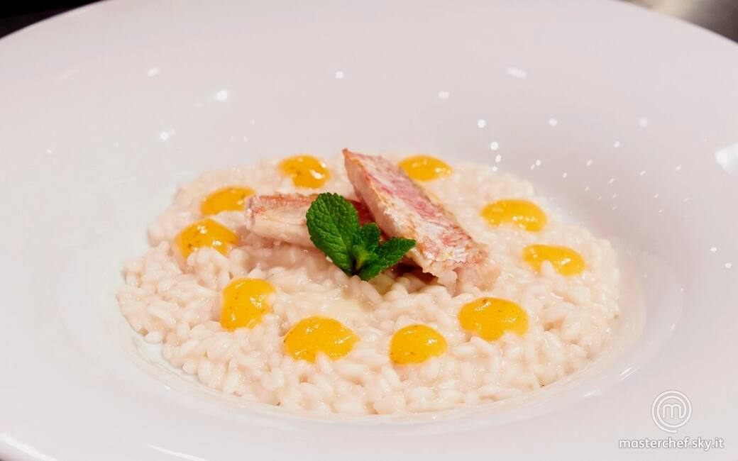 Impiattare mettendo il risotto nel piatto e disponendo sopra delle sfere di cachi e al centro i filetti di triglia.