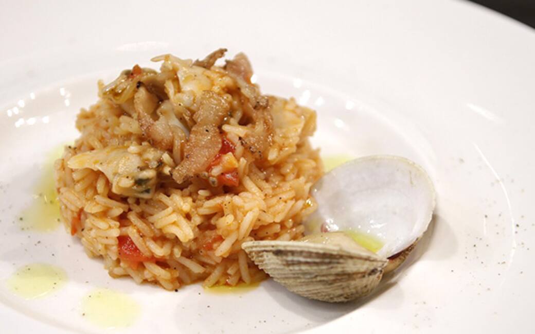 Comporre il piatto sotto il riso e decorare con i molluschi e del lardo tostato in una padella antiaderente.