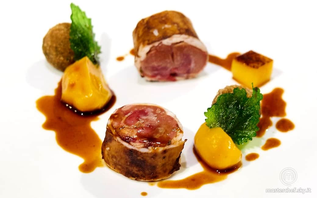 Impiattare disponendo una lacrima di purea di mango sul piatto, aggiungere tre cubi precedentemente scottati, il rognone tagliato in tre pezzi, le crocchette di ortica precedentemente fritte e finite con una cucchiaiata di fondo di vitello. Aggiungere qualche foglia di ortica fritta e ultimare con qualche fiocco di sale Maldon.