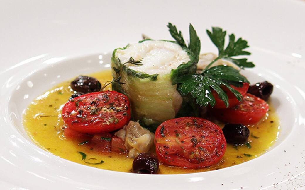 Lavare la lattuga e sbollentarla per pochi secondi in acqua bollente, scolare e raffreddare subito in acqua e ghiaccio. Asciugare su carta assorbente, stendere, appoggiare sopra il filetto di pesce e arrotolare il tutto in modo che le foglie coprano totalmente la superficie del filetto. Avvolgere il rotolo con della pellicola trasparente e stringere ai lati per dare la forma.