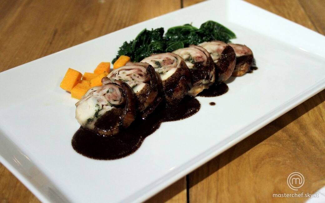 Tagliare a fette il rollè, aggiungere la salsa al caffè e guarnire con le verdure.