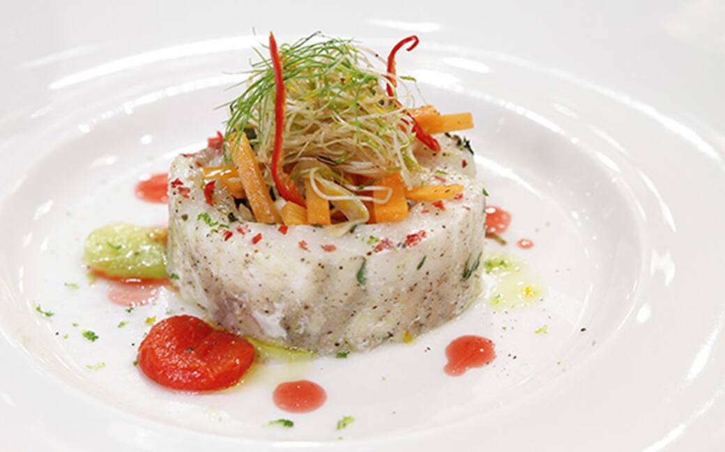 Posizionare al centro del piatto il cestino di rombo e porre all'interno le verdure croccanti, adagiarvi sopra nell'ordine: un ciuffetto di germogli di finocchio, germogli di erba cipollina e 2/3 striscioline di peperoncino. Terminare l'impiattamento decorando il cestino con i medaglioni di peperoni saltati e piccoli spot di salsa al peperone e un filo d'olio.