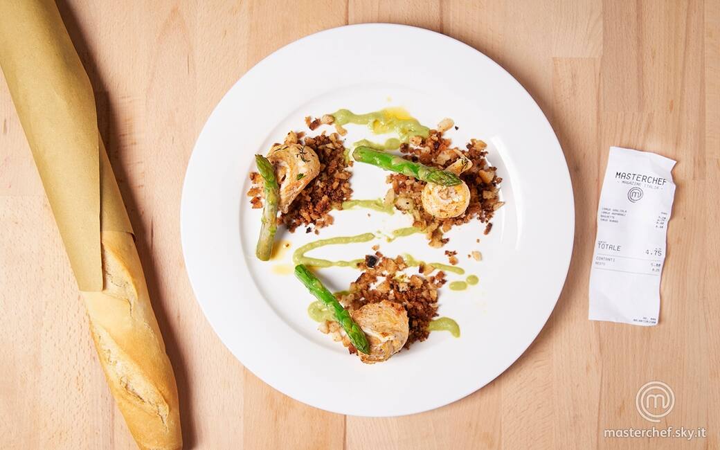 In un piatto circolare creare delle tre montagnette di crumble. Appoggiare i rotoli di sogliola sulle montagnette. Disporre le teste di asparagi e creare delle strisce di asparagi frullati nel biberon.