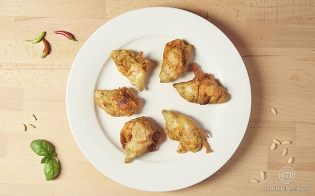 Intanto mettere a scaldare líolio di semi di arachide nella padella della frittura. Mettere in una sac à poche la farcia e farcire gli otto fiori di zucca. Inserire in un solo fiore di zucca un piccolo peperoncino piccante fresco. Riprendere la pastella lasciata nel frigo. Immergere i fiori di zucca uno ad uno nella pastella, scolarli. Gettare un cucchiaio di pastella nell'olio bollente per controllare la temperatura. Passare i fiori di zucca nella padella con cucchiaio e forchetta. Friggerli per pochi minuti girandoli di tanto in tanto. Una volta che hanno raggiunto la giusta doratura toglierli con una schiumarola e porli in un piatto ricoperti da carta da fritto.