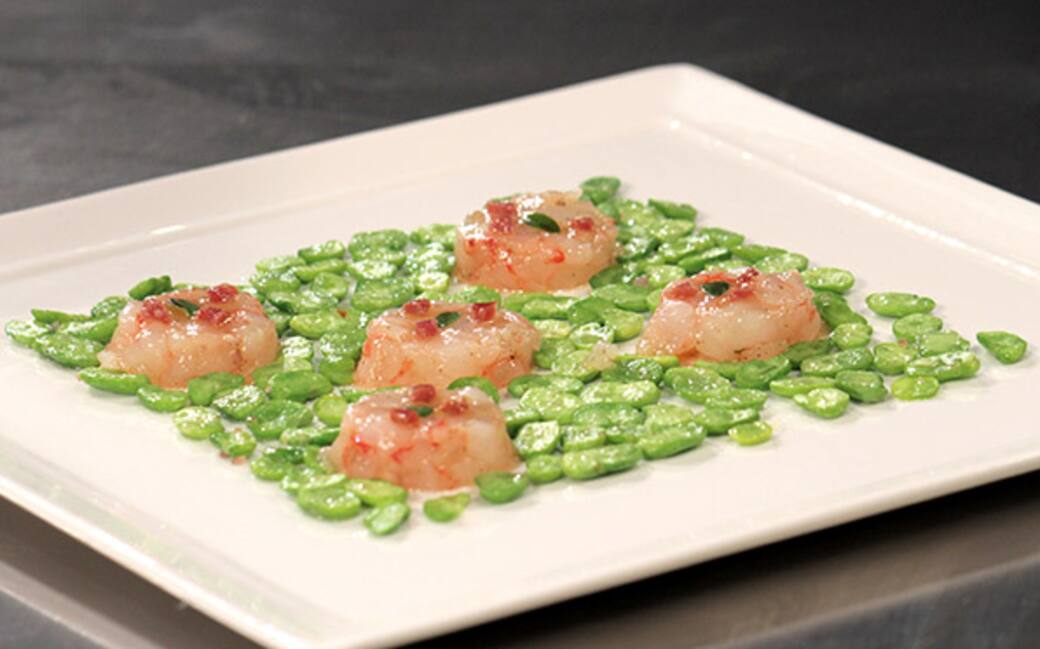 Sminuzzare la pasta di salame; far sudare in padella con poco olio, mezzo scalogno tagliato finissimo e aggiungervi 1 cucchiaio di pasta di salame. Aggiungere le fave, salare e sfumare con il vino bianco.